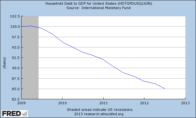 In Ms af Jochnick's opinion, developments in recent years have shown that central banks should have an overall perspective with regard to both monetary policy and financial stability, as financial stability is a necessary condition for monetary policy to function efficiently. This is also documented in research and analysis. What this means is the focus is on the inflation target and our independence, but that we thus cannot disregard the slightly longer run effects with regard to financial imbalances building up, for instance... Monetary policy is a blunt instrument when it comes to counteracting the build-up of financial bubbles, but financial imbalances can lead to major problems for companies and households and ultimately cause lower growth and higher unemployment. Just the fact that the Riksbank has talked about the risks entailed in the high level of household debt has contributed to stabilising the household debt ratio, albeit at a high level, according to Ms af Jochnick.As those comments make clear, one concern in particular is that low interest rates are contributing to a higher household debt ratio. This struck me as somewhat strange because household debt to GDP in the United States has been falling steadily despite our low interest rates (see FRED graph at bottom.) I wonder if she is correct that the Riksbank has actually managed to stabilize the household debt ratio just by talking about the risks of high levels of household debt! An article in Reuters says:
